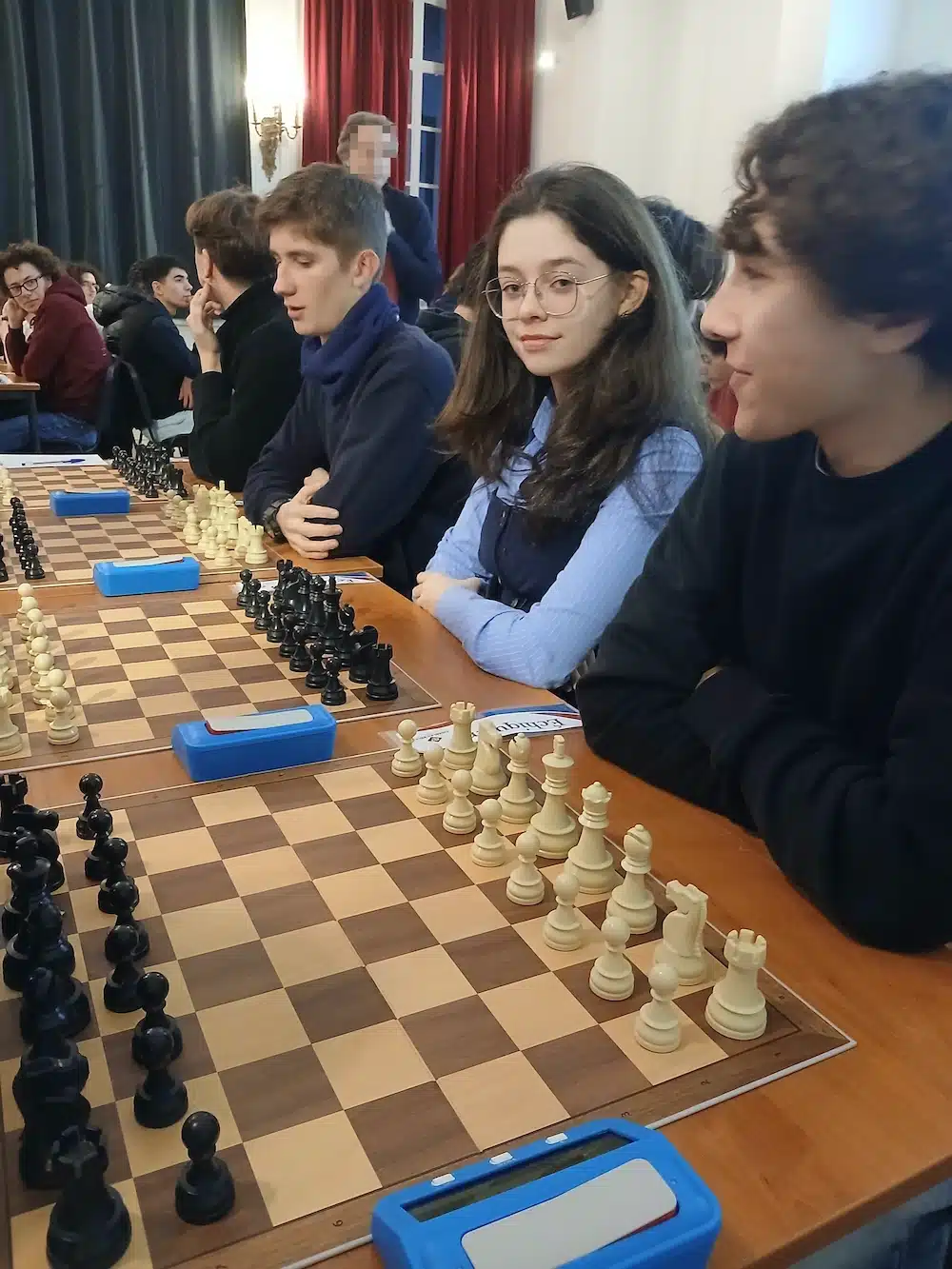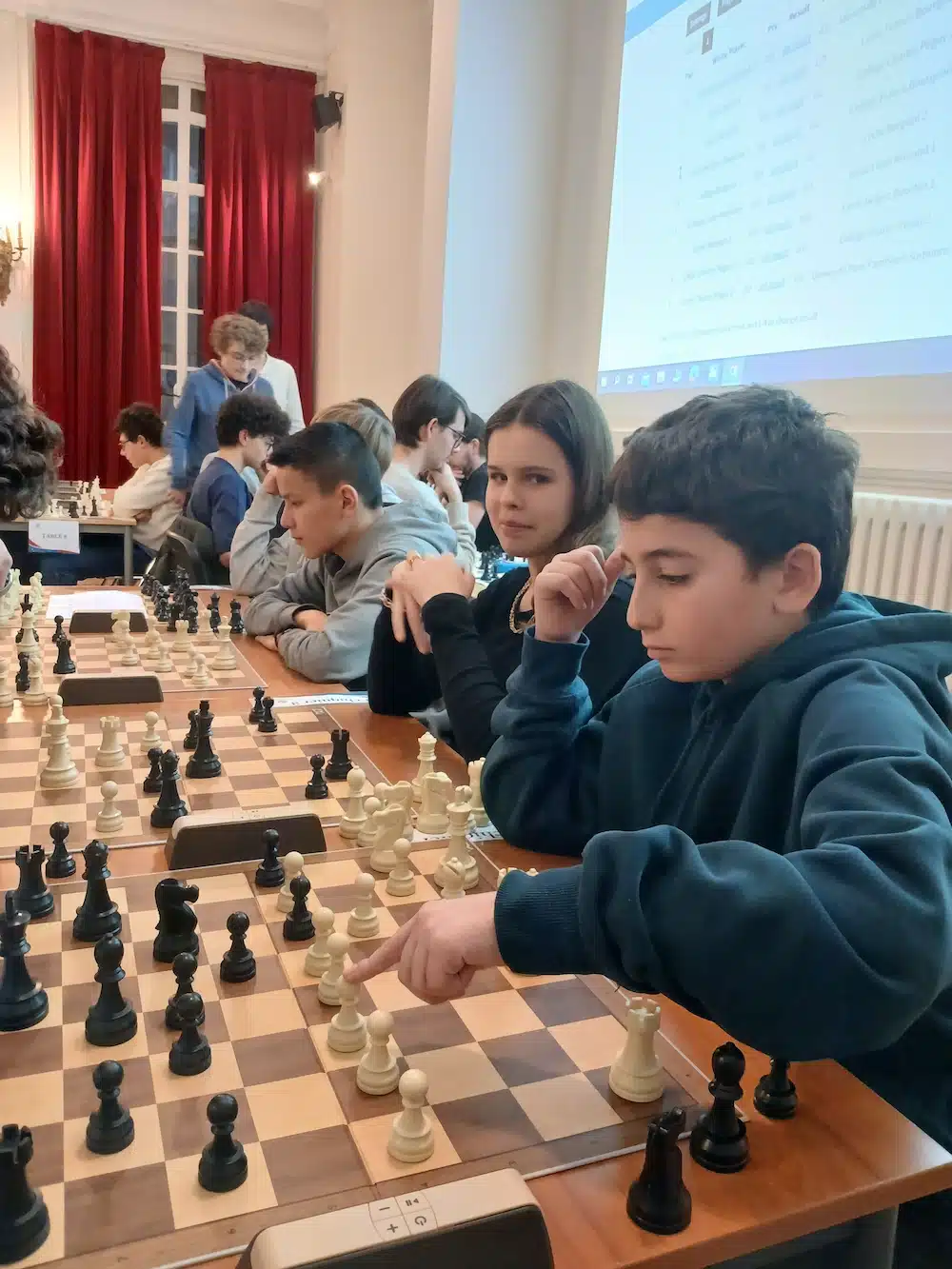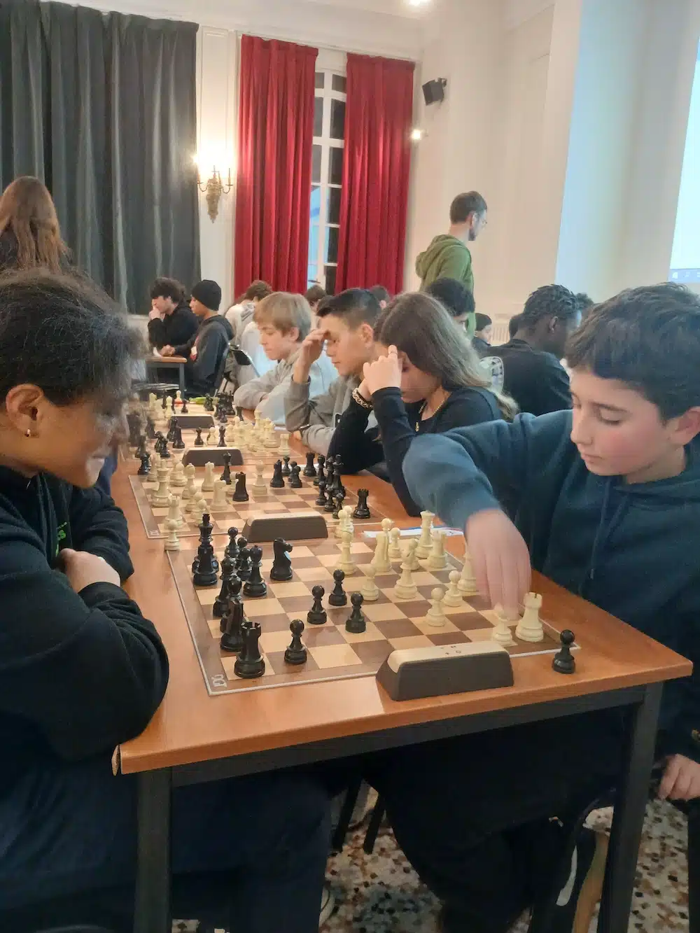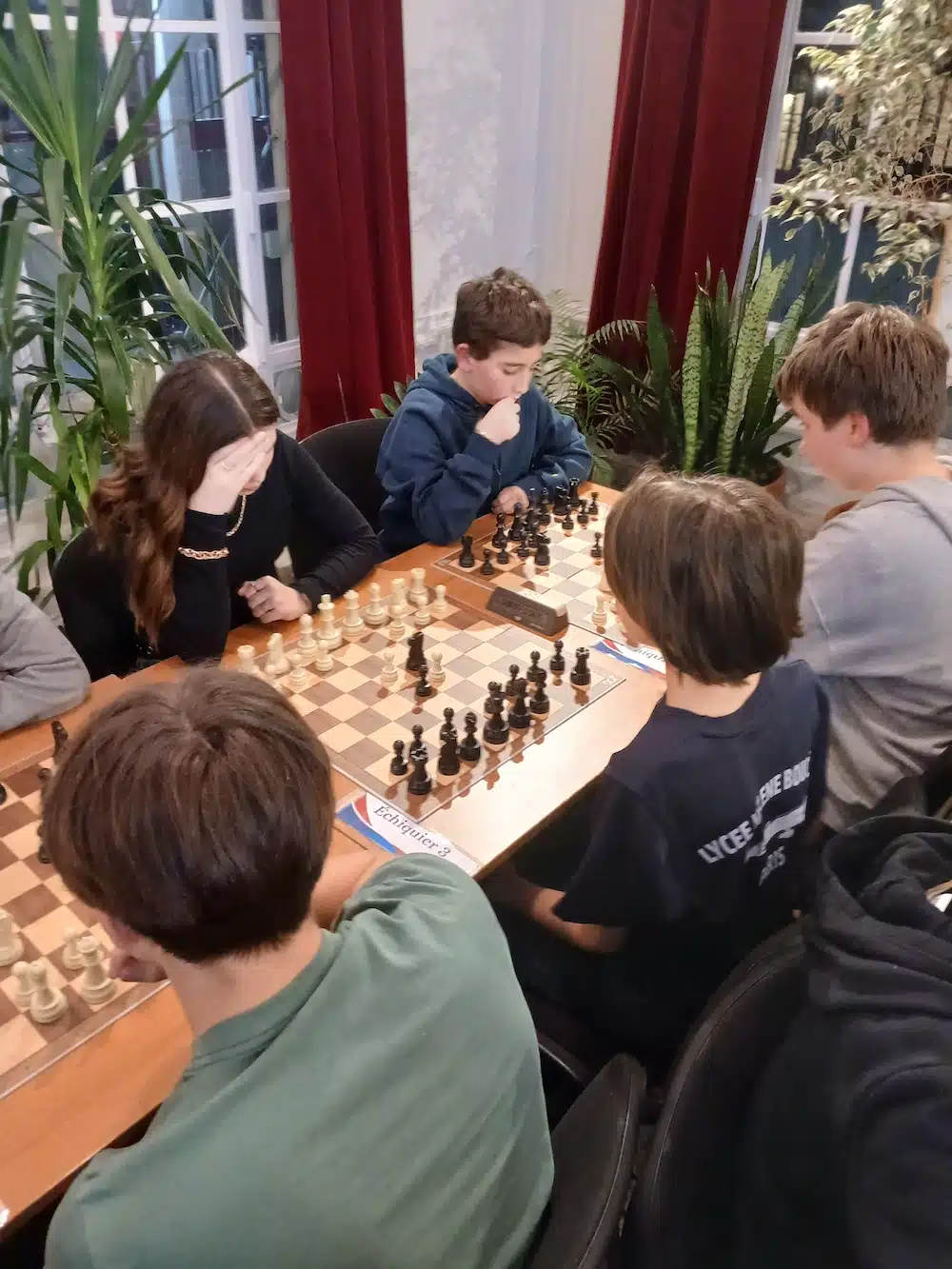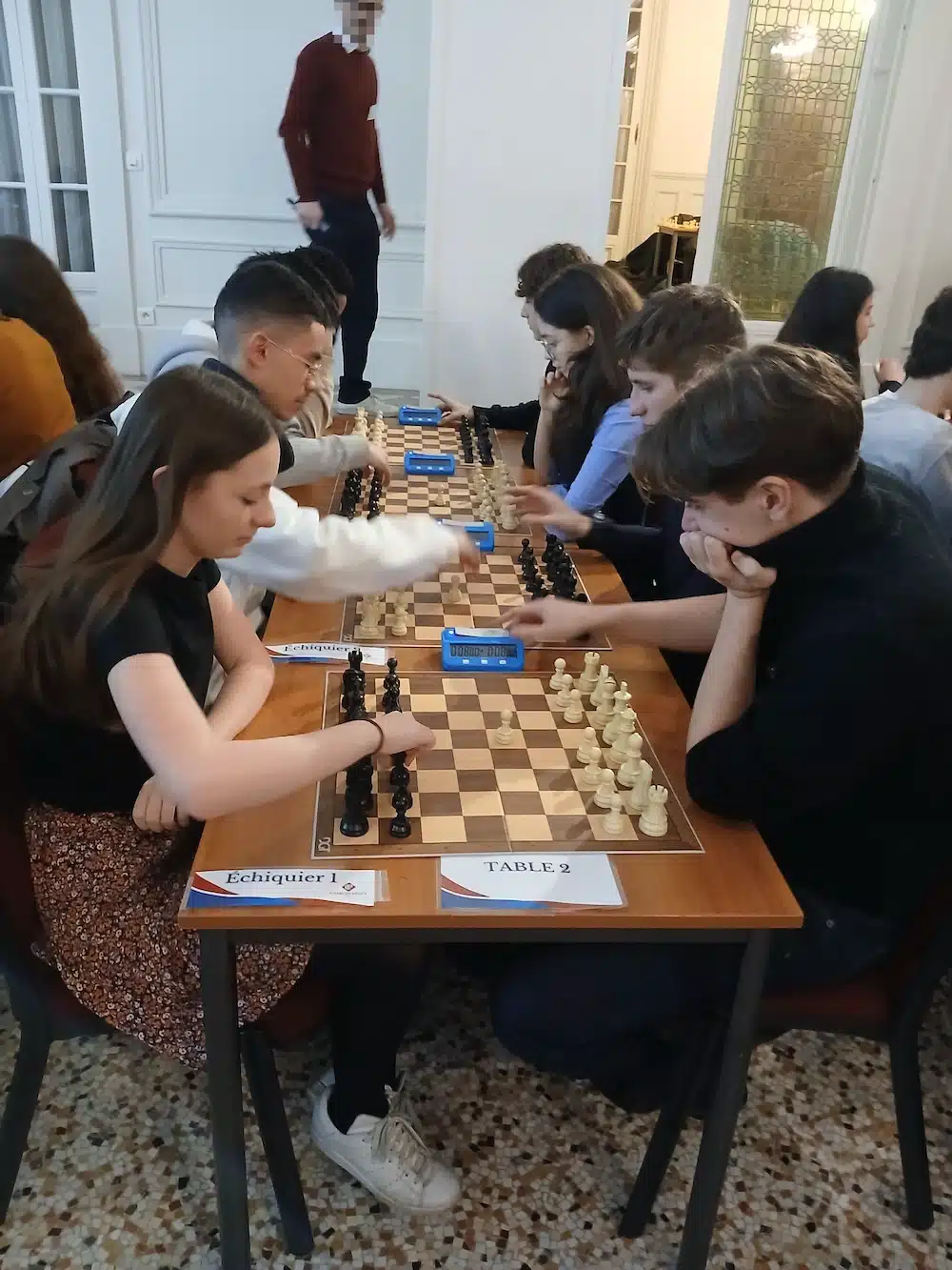 Les joueurs étant tous très motivés, toutes les parties furent très disputées. Je ne vais pas entrer dans le détail du tournoi, mais juste vous dire que l’ambiance était magnifique et l’état d’esprit de nos compétiteurs tout à fait exemplaire. Nos lycéens, après un sans faute pendant les quatre premières rondes, furent appariés contre l’épouvantail, à savoir Louis-Le-Grand. Hélas les choses se compliquèrent très vite, à cause notamment d’un maître FIDE à l’échiquier 1, que Pierre ne réussit pas à contenir. Après cette unique défaite, nos lycéens terminent à la 5eme place, juste derrière les collégiens qui ont pu bénéficier d’un tirage au sort plus favorable…