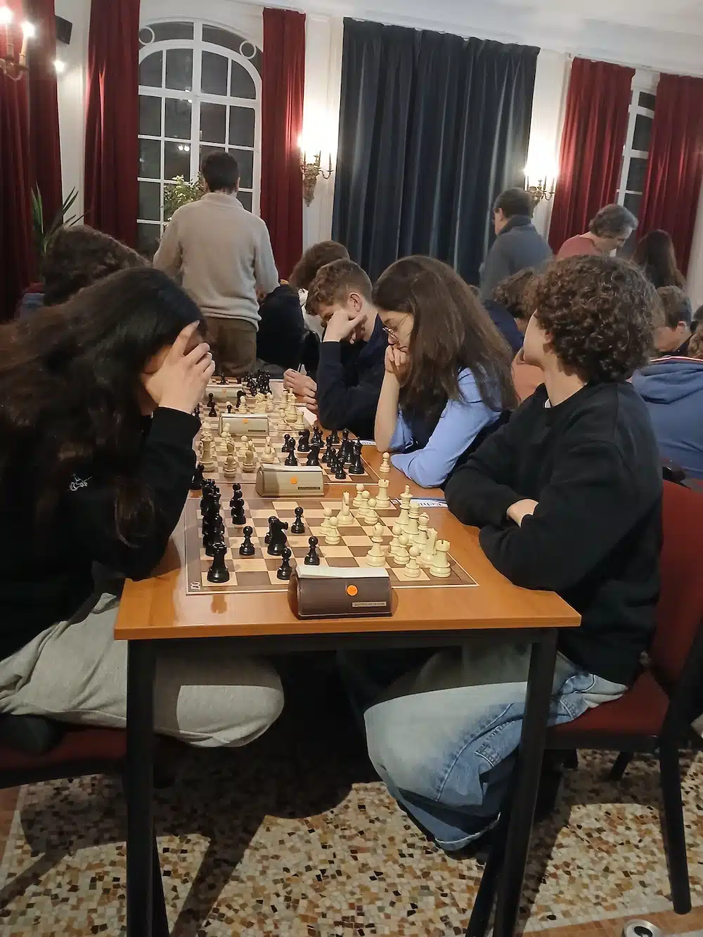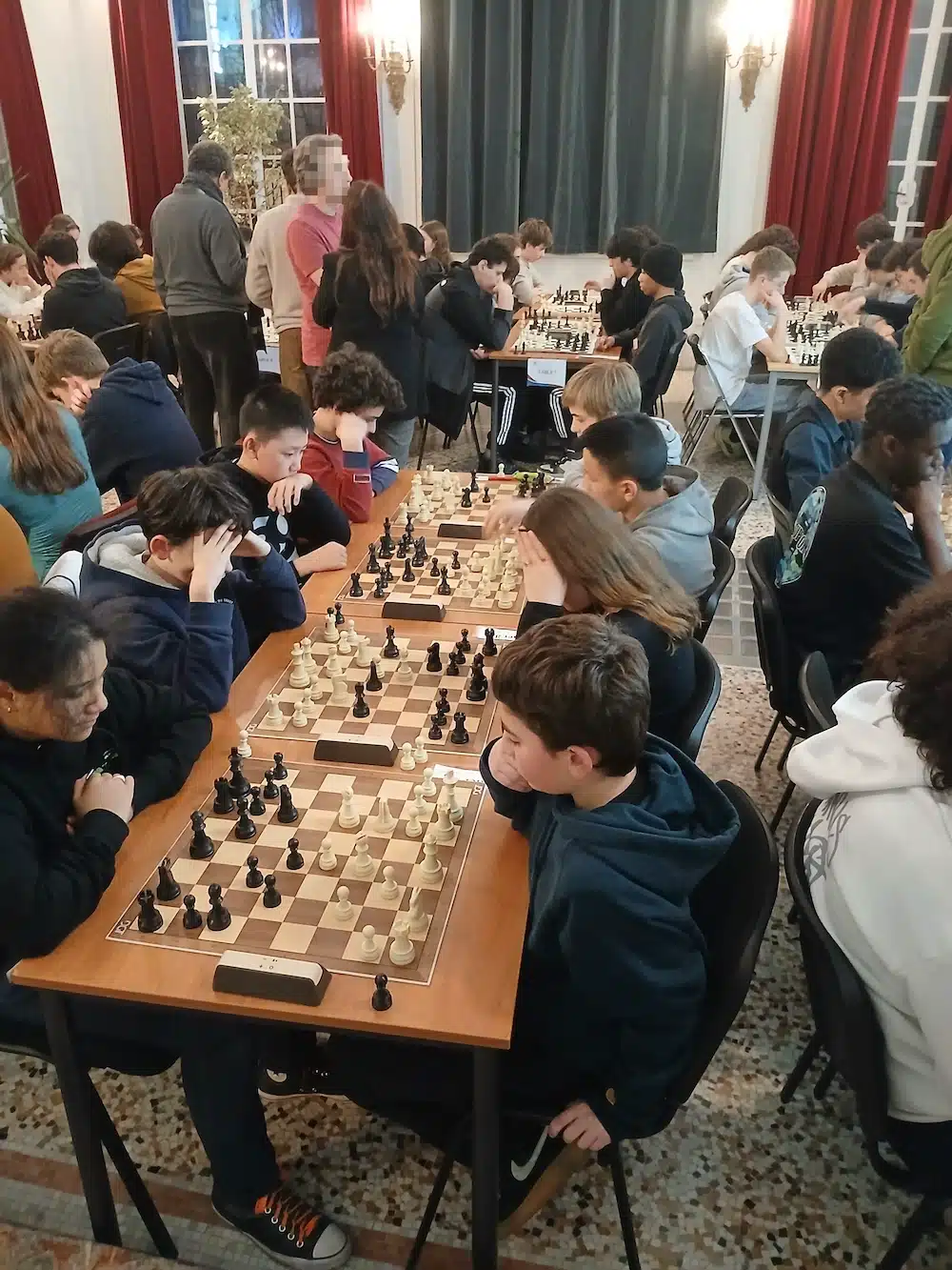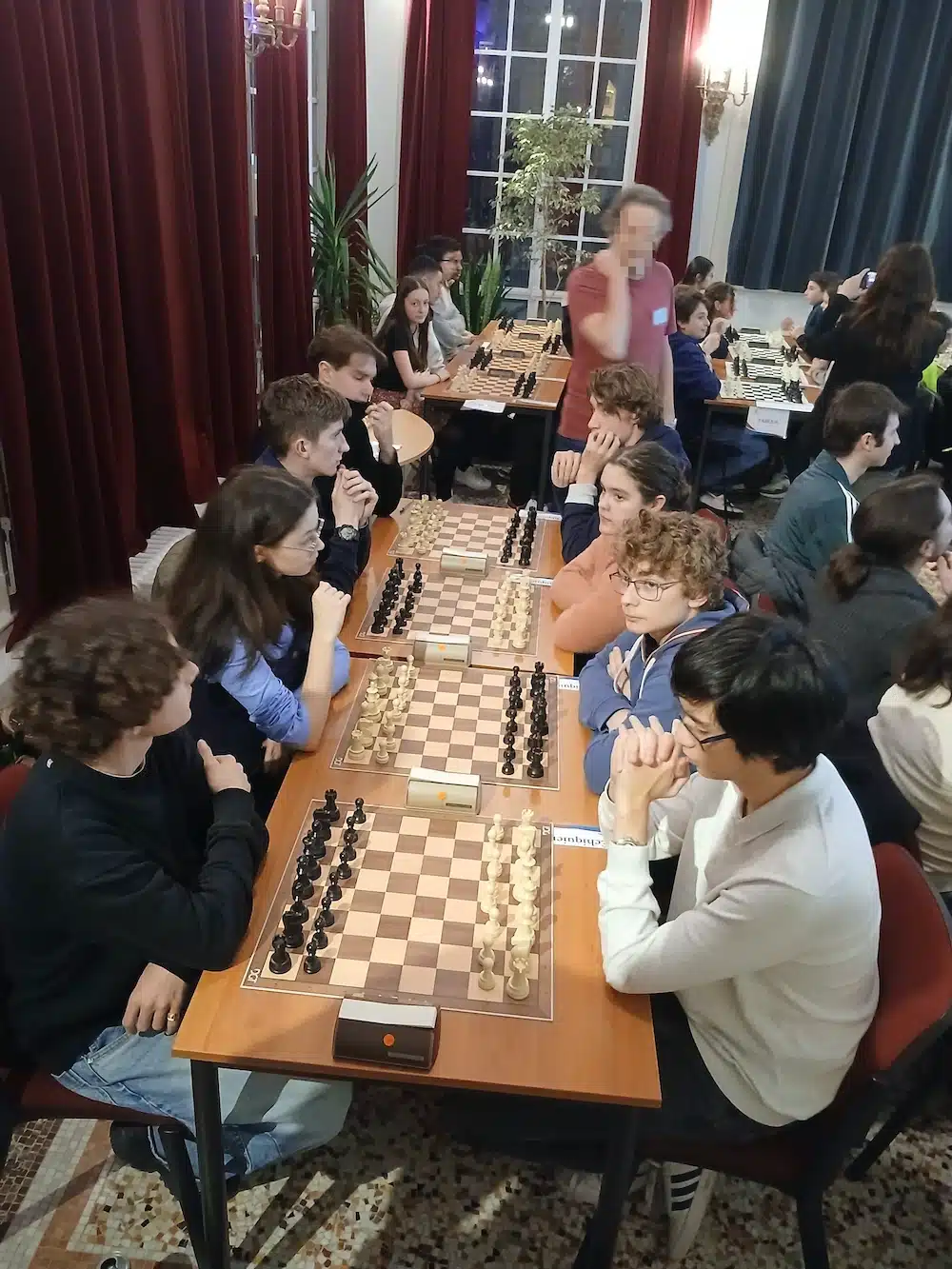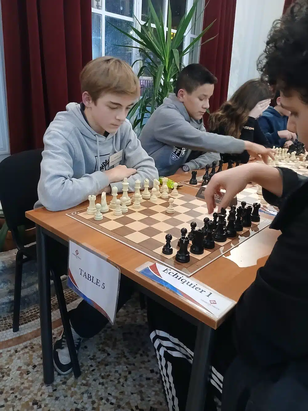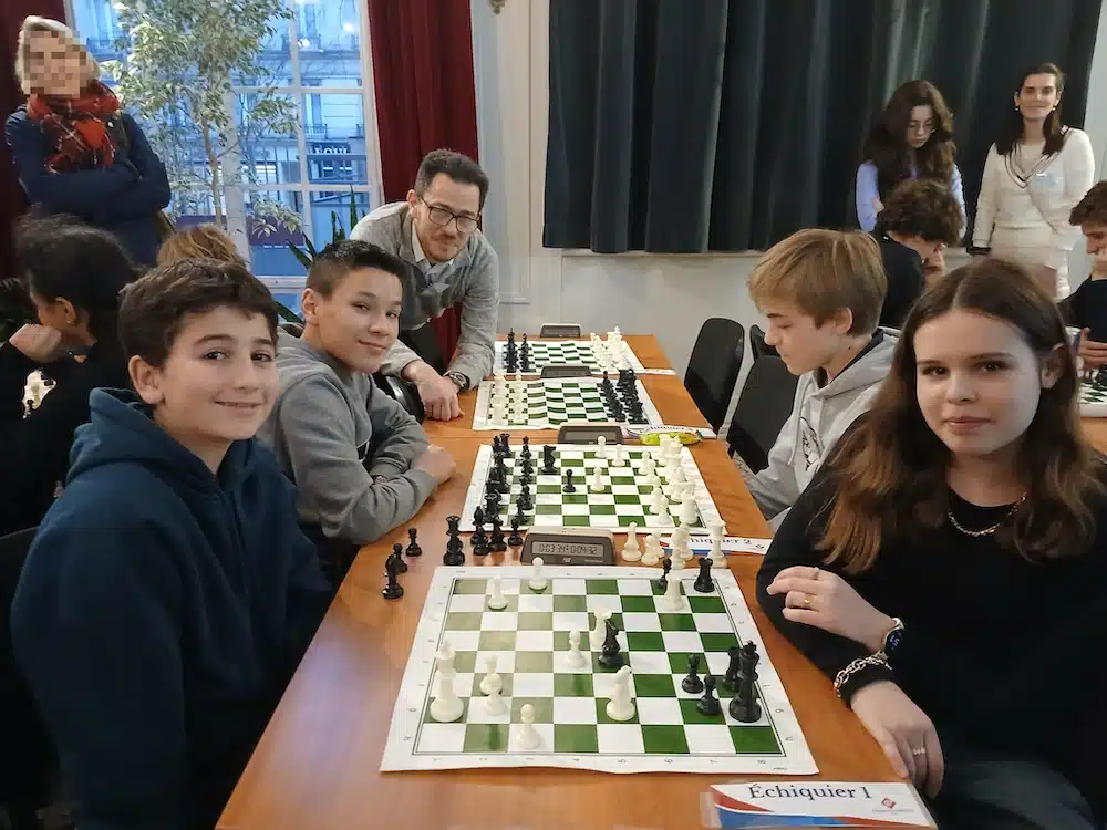 Les joueurs étant tous très motivés, toutes les parties furent très disputées. Je ne vais pas entrer dans le détail du tournoi, mais juste vous dire que l’ambiance était magnifique et l’état d’esprit de nos compétiteurs tout à fait exemplaire. Nos lycéens, après un sans faute pendant les quatre premières rondes, furent appariés contre l’épouvantail, à savoir Louis-Le-Grand. Hélas les choses se compliquèrent très vite, à cause notamment d’un maître FIDE à l’échiquier 1, que Pierre ne réussit pas à contenir. Après cette unique défaite, nos lycéens terminent à la 5eme place, juste derrière les collégiens qui ont pu bénéficier d’un tirage au sort plus favorable…