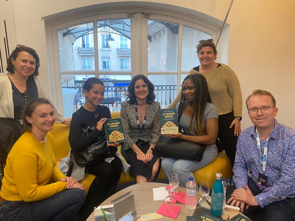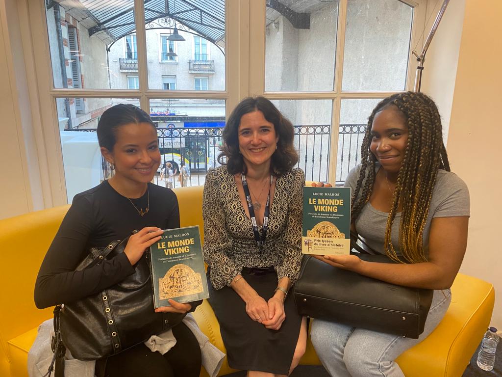 Domitille, Yro, Tara, Eve, élèves de Terminale, accompagnés par Mmes Truel , Soumastre, Rêve-Moreau et Fauvette sont venus aux Rendez-vous de l’Histoire de Blois pour assister à la remise du Prix des lycéens du livre d’histoire 2023 attribué, parmi une sélection de 5 livres, à Lucie Malbos pour son livre Le monde viking. Ils ont pu faire dédicacer l’exemplaire du cdi et poser des questions à son auteur.